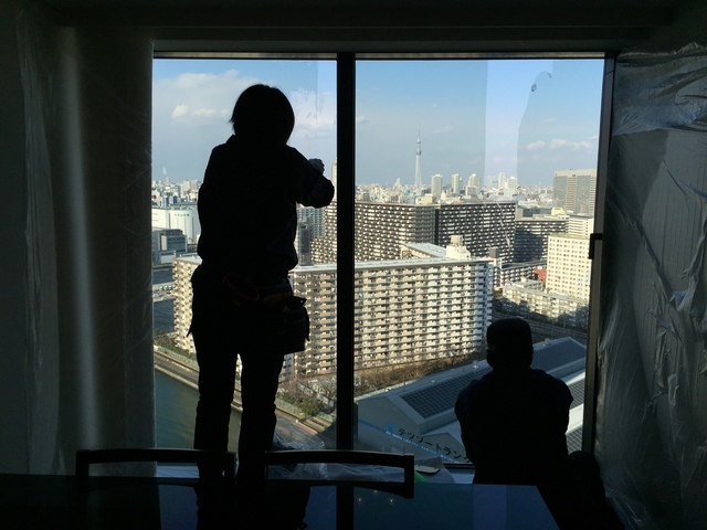 剥がし終えて窓ガラスの残ったノリもキレイに取り除き、貼付け施工になります。